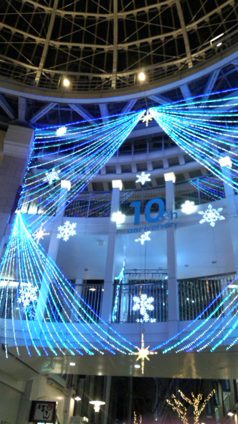 夜8時頃、中央通りの交差点から兵庫町商店街のアーケードを歩いて行きましたが、100mほど入った丸亀町商店街との交差点に見事なドームがあります。"10th anniversary"の青いイルミネーションが、とても見事でした。ドームの周囲には、センスのよさそうなブティックもあります。