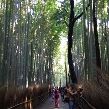 トロッコ嵐山から野宮神社に行く途中に、竹林が美しい散策道がありました。嵐山を象徴する竹林の径で、長くはありませんが、長く延びた竹林がつくる木陰はなんとも風情がありました。外国人観光客には大人気で、スマホで自撮りしていました。