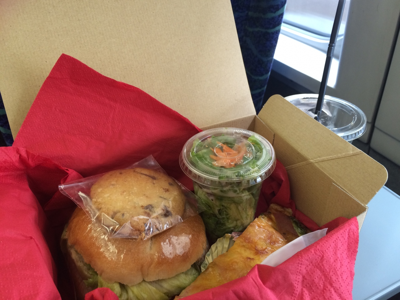 ベーグルサンドとハーフサイズのキッシュ。ミニサラダと焼き菓子が入っています。