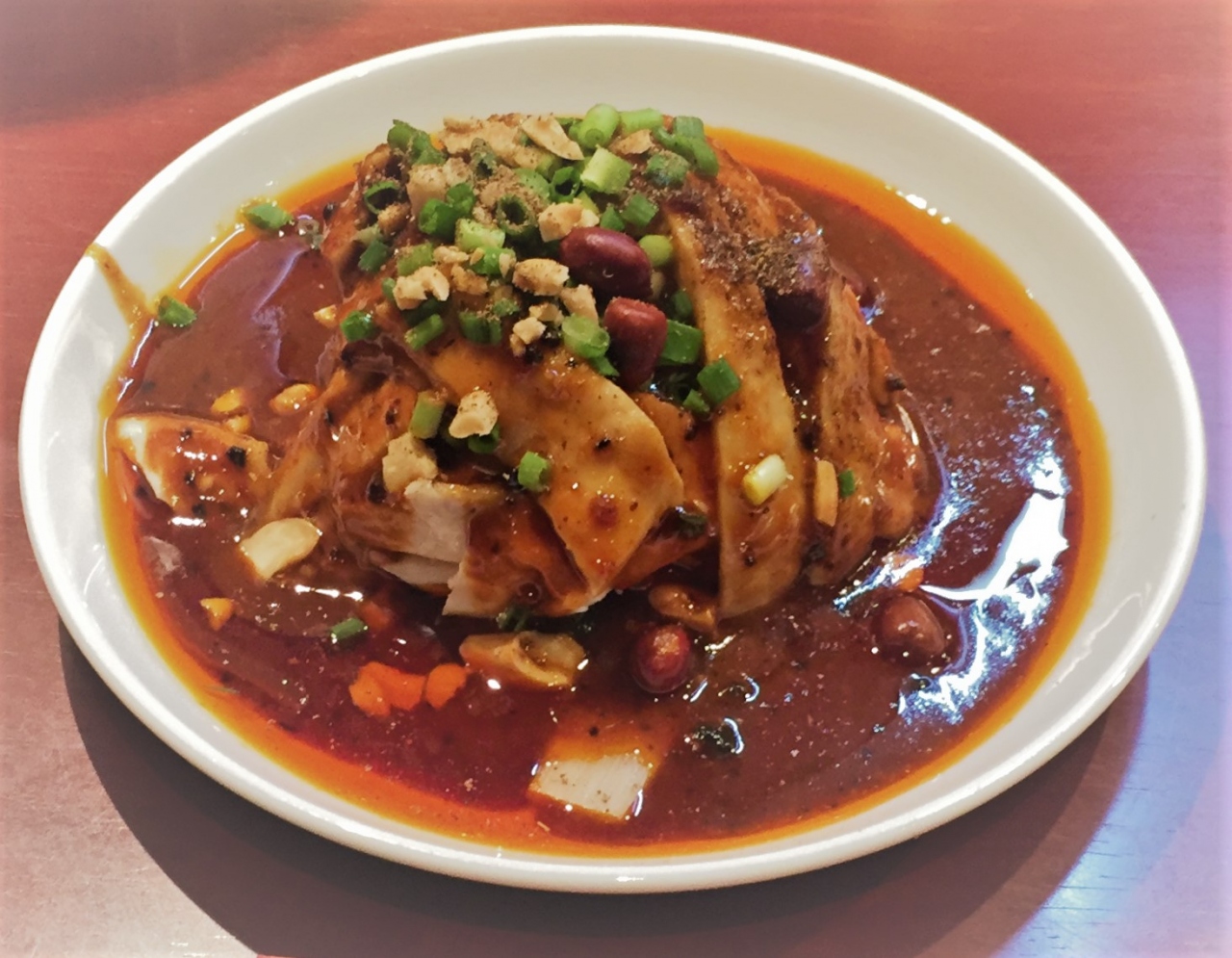 よだれ鶏は、五香ラー油と四川サンショウで仕上げた一品、辛いだけでなく深い味わいで絶品です。