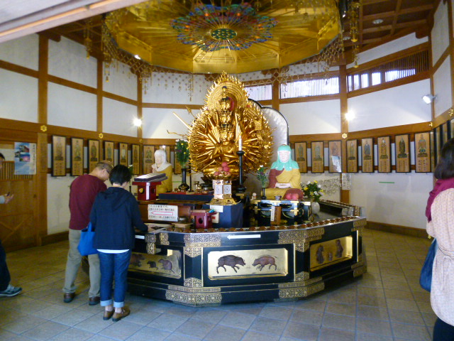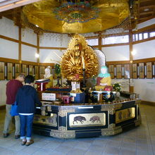 木々に覆われた万拝堂は平成に入って建てられたお堂です。堂内では全国各地の神社仏閣の諸仏・諸菩薩・天善神、世界中の神々とともに奉安して祀られて、手で数珠を回し一周してお参りします。