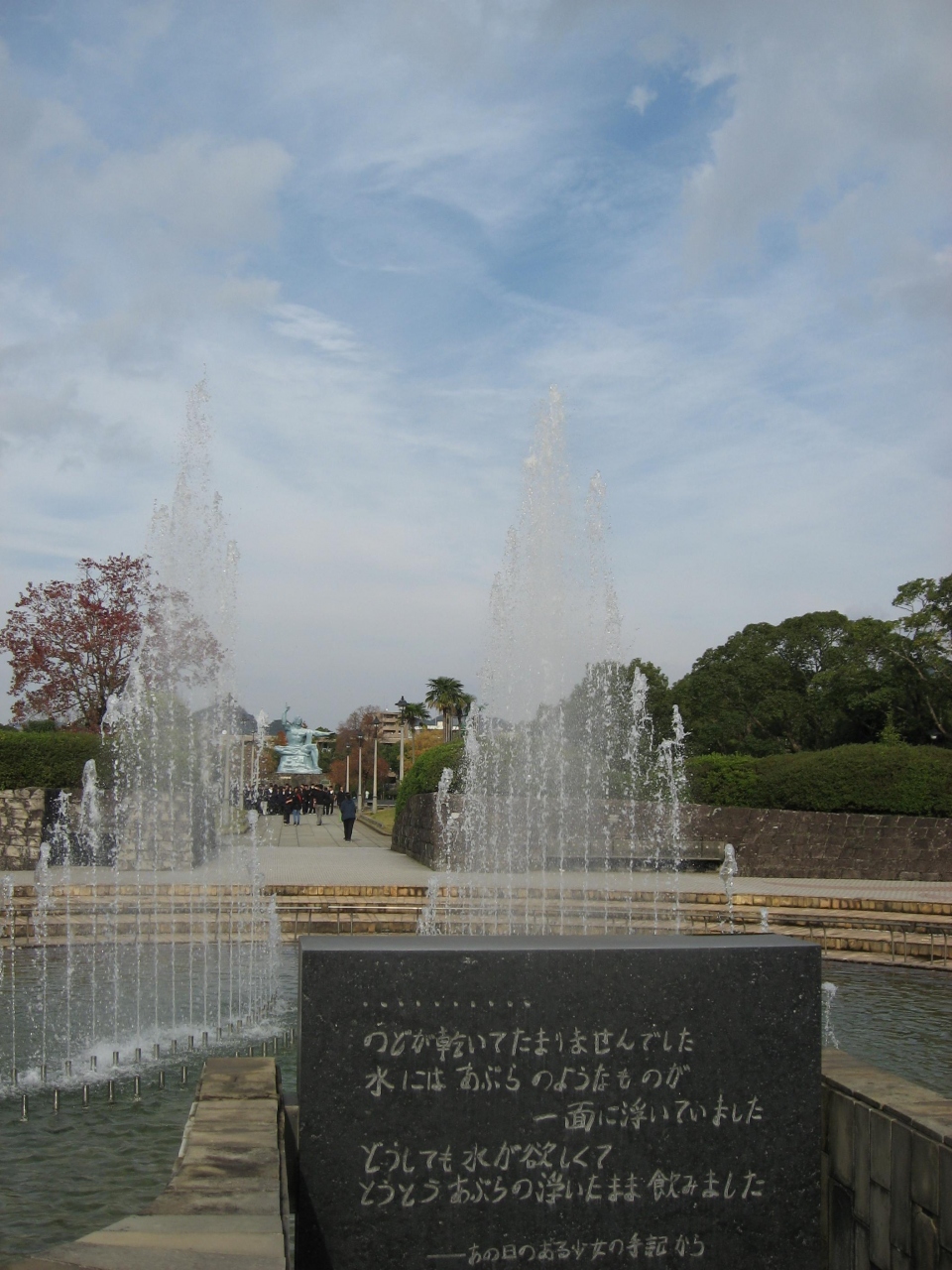 エスカレーターを上ると、すぐにある噴水です、噴水の真ん中から平和の像が見えたので、はじめは公園にある何でもない噴水だろうと思っていましたが、石碑に書いてある文章を読んで衝撃を受けました。