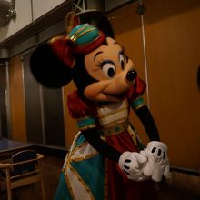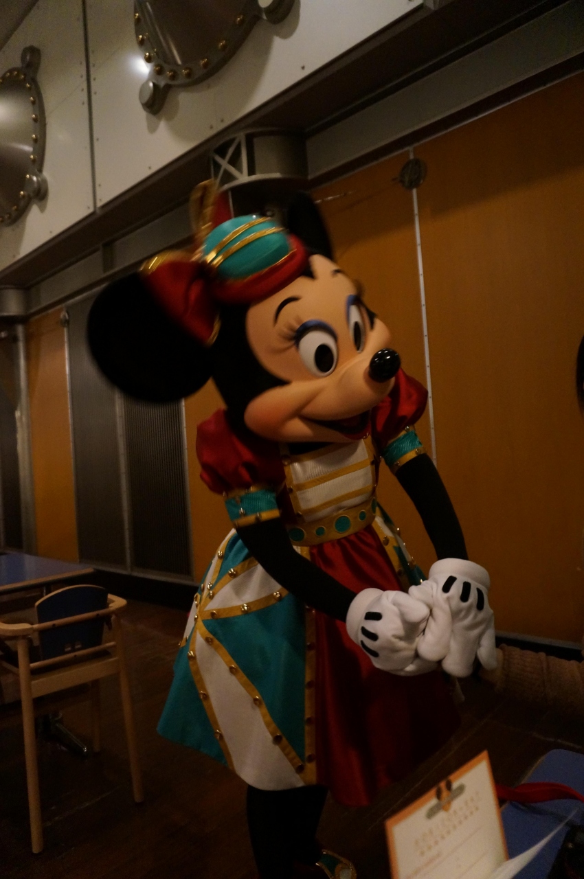 まず並んで、ディナーの予約をしました。たっぷり遊んでいよいよミッキーたちに会えるレストランで食事です。シーフードのカニクリームスープ、チップ&デールクリームケーキなどを選びました。ミッキーとミニーの赤い服が可愛かったです。一緒に写真を撮ってもらいました。