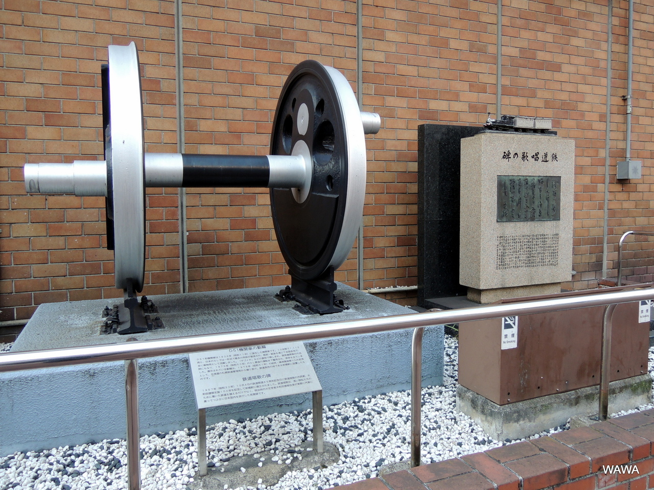 大きな機関車の車輪と共に、歌の一節が銅板に刻まれています。