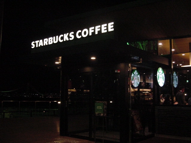 神戸淡路鳴門自動車道で淡路島に渡ると、最初のサービスエリアが淡路SAですが、その中にあるコーヒーショップです。この店の売りは展望でしょう。目の前が明石海峡大橋で、その向こうに明石や神戸の夜景が見えます。スタバの味は定番。テイクアウトも便利です。