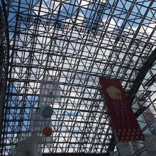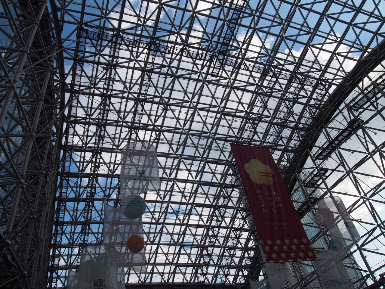 金沢駅の東口を出てすぐの場所にもてなしドームはあります。鉄骨のガラス張りの構造物で天井高くにあります。光もよく差し込むのでとても開放感があります。ヨーロッパの空港、ターミナル駅などでよく鉄骨ガラス張りの建物があるのですが、金沢駅のは駅の建物ではなく、駅から出た場所にあるのが斬新です。このような建て方もあったのかという感心です。