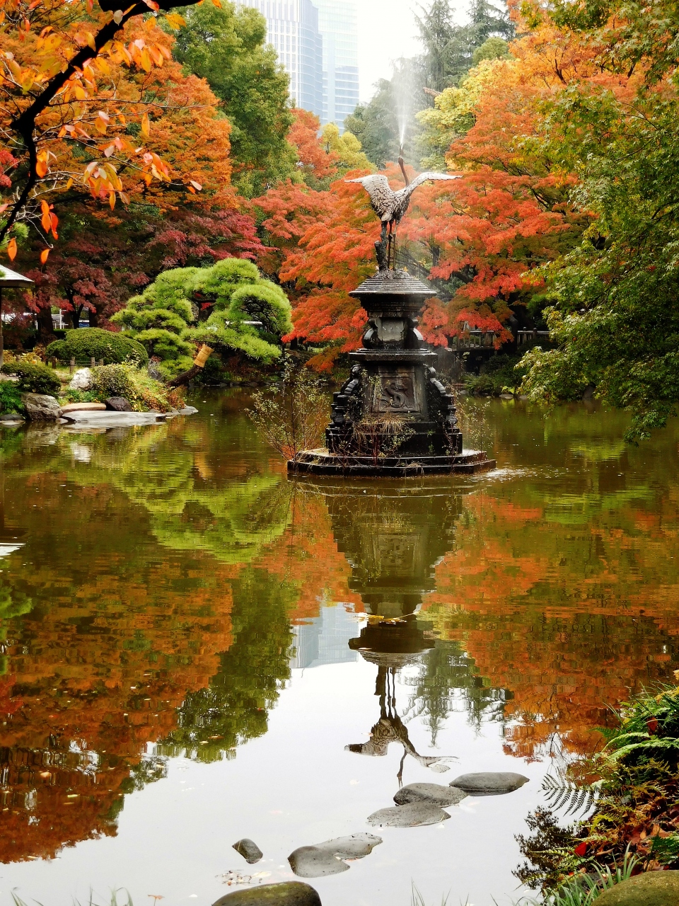雲形池の周りには赤や黄色の紅葉が見られたり、池に映る紅葉も楽しめます。