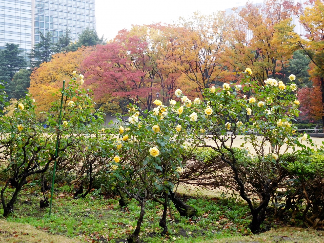 日比谷公園の芝生花壇の回りには薔薇が植えてあり、赤や黄色などのいろいろな種類のバラが咲いています。