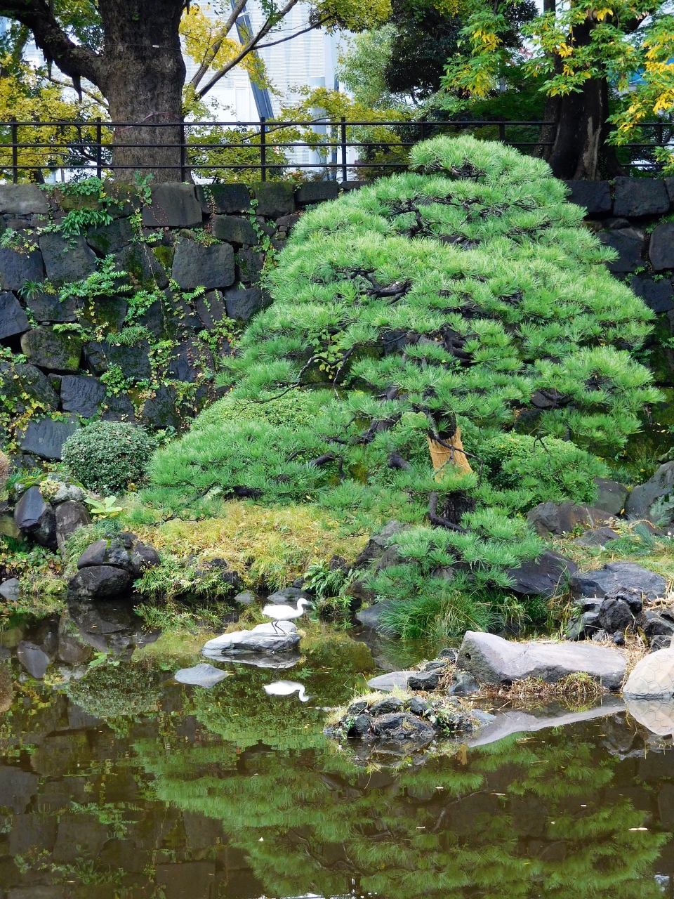 心字池の側には手入れの行き届いた松があります。
