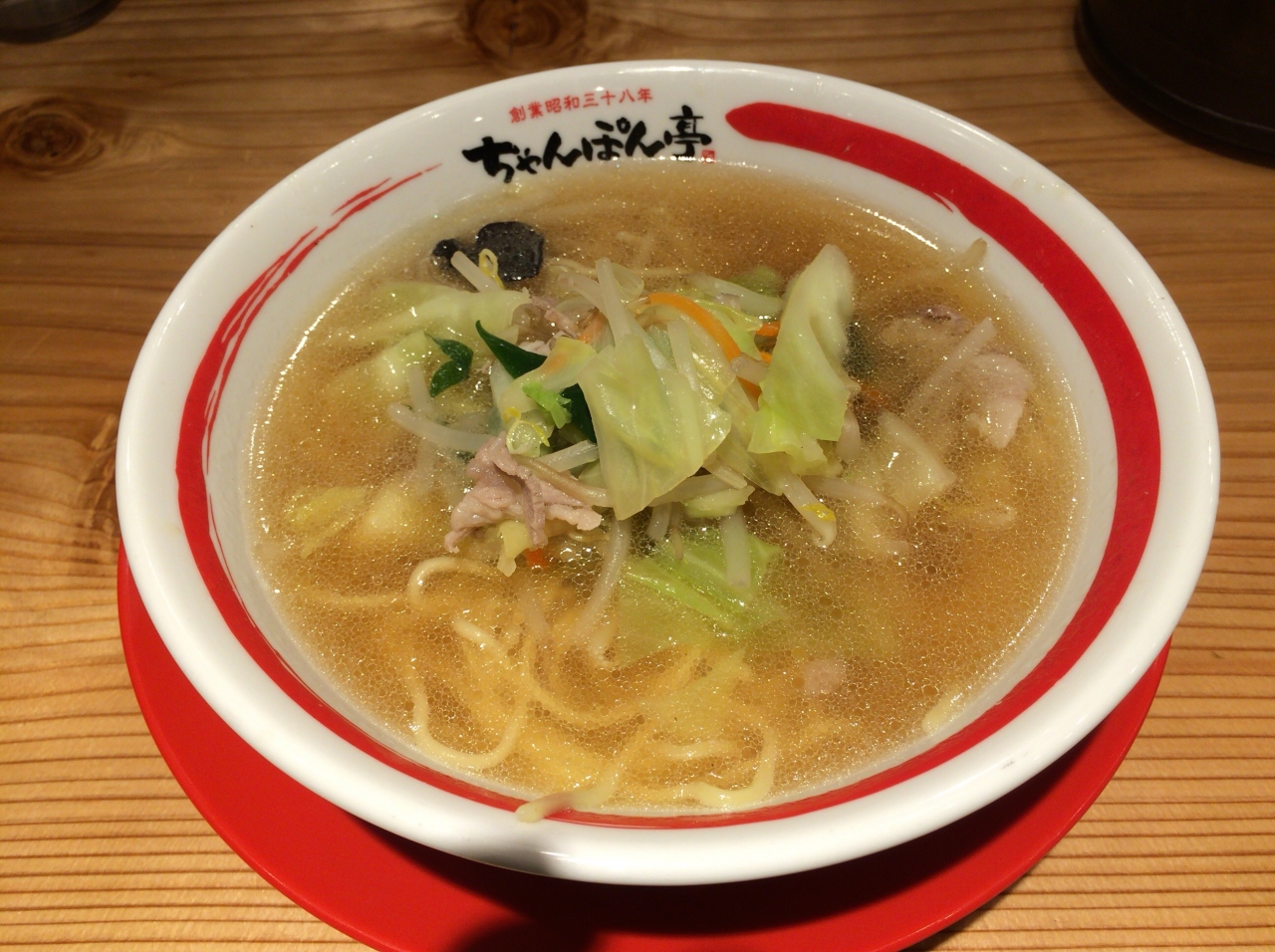 長崎ちゃんぽとは全く非なるもので、鶏がらの澄んだスープに炒めた野菜をのせてある