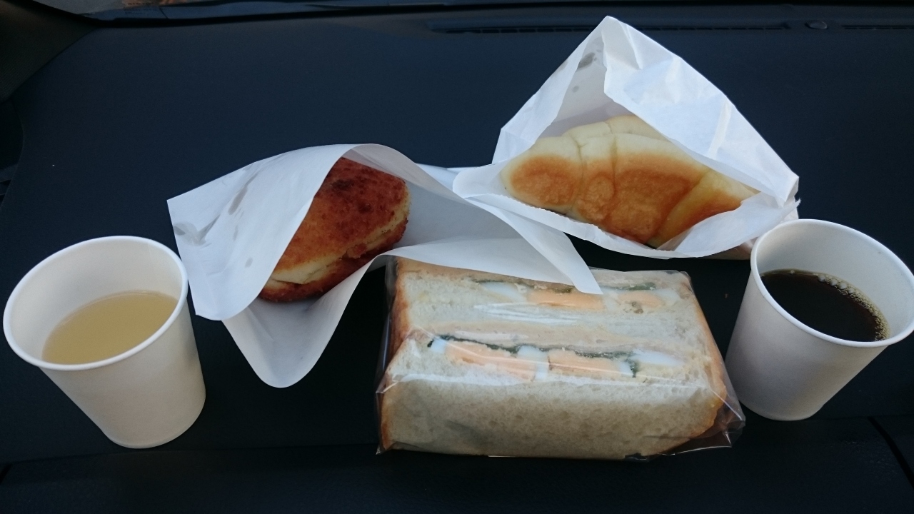 あれこれ迷って、サンドイッチなど3つ購入して、車内で朝食タイム。