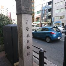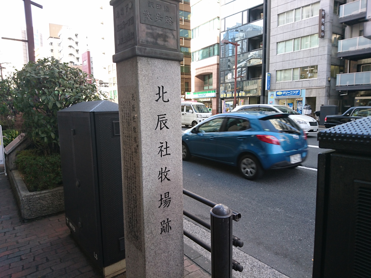 北辰社牧場跡碑は飯田橋駅東口から目白通りを九段方面に400mほど進んだところに立っています。