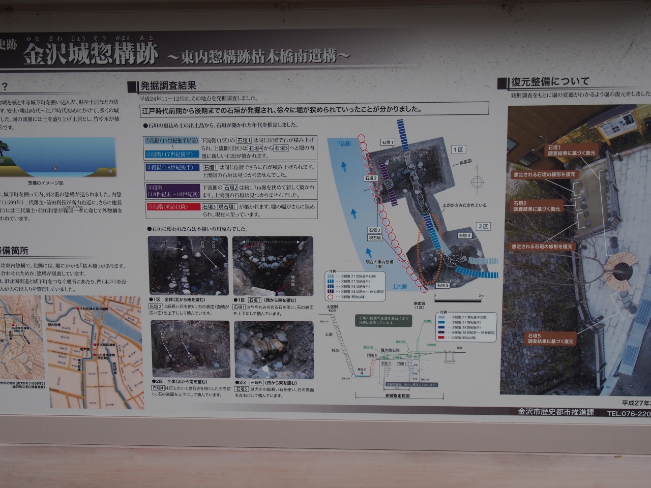 金沢城の敵からの襲来から守るための外堀、堤などの遺跡(金沢城惣構跡)が浅野川の浅野大橋近くの枯木橋のすぐ近くにあります。発掘後の遺跡で観光客にも見やすいように保存展示されています。すぐ近くには説明板もあり、このようなものが発掘保存されているのだとよくわかります。