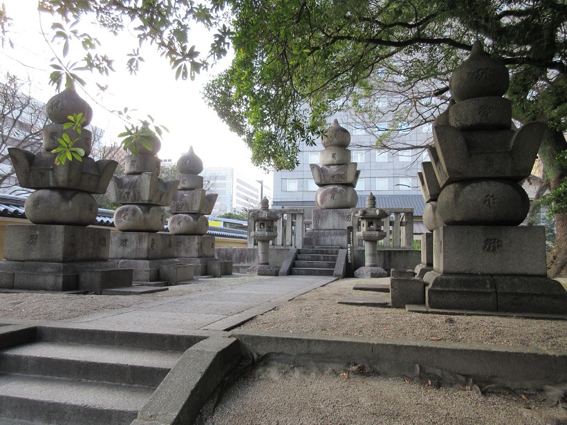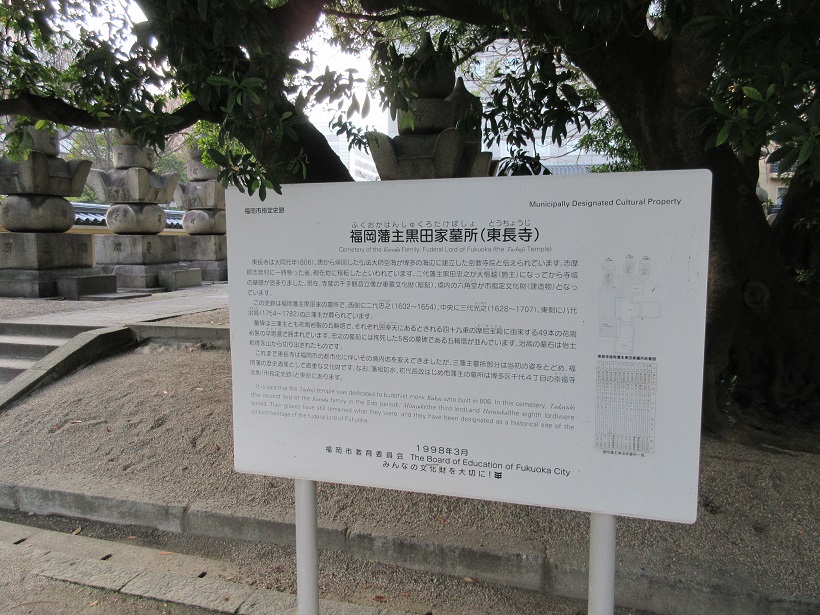 博多駅から徒歩12、13分の場所にある東長寺の境内に福岡藩主黒田家のお墓がありました。初代藩主は無いのですが、第二代藩主の忠之や、3代藩主の光之らの墓地とのこと。五輪塔の形状をしたものが整然とならぶ様は壮観です。また、墓所入口には見取り図入りの案内表示があり、誰の墓所か詳しく説明されていて分かりやすかったです。