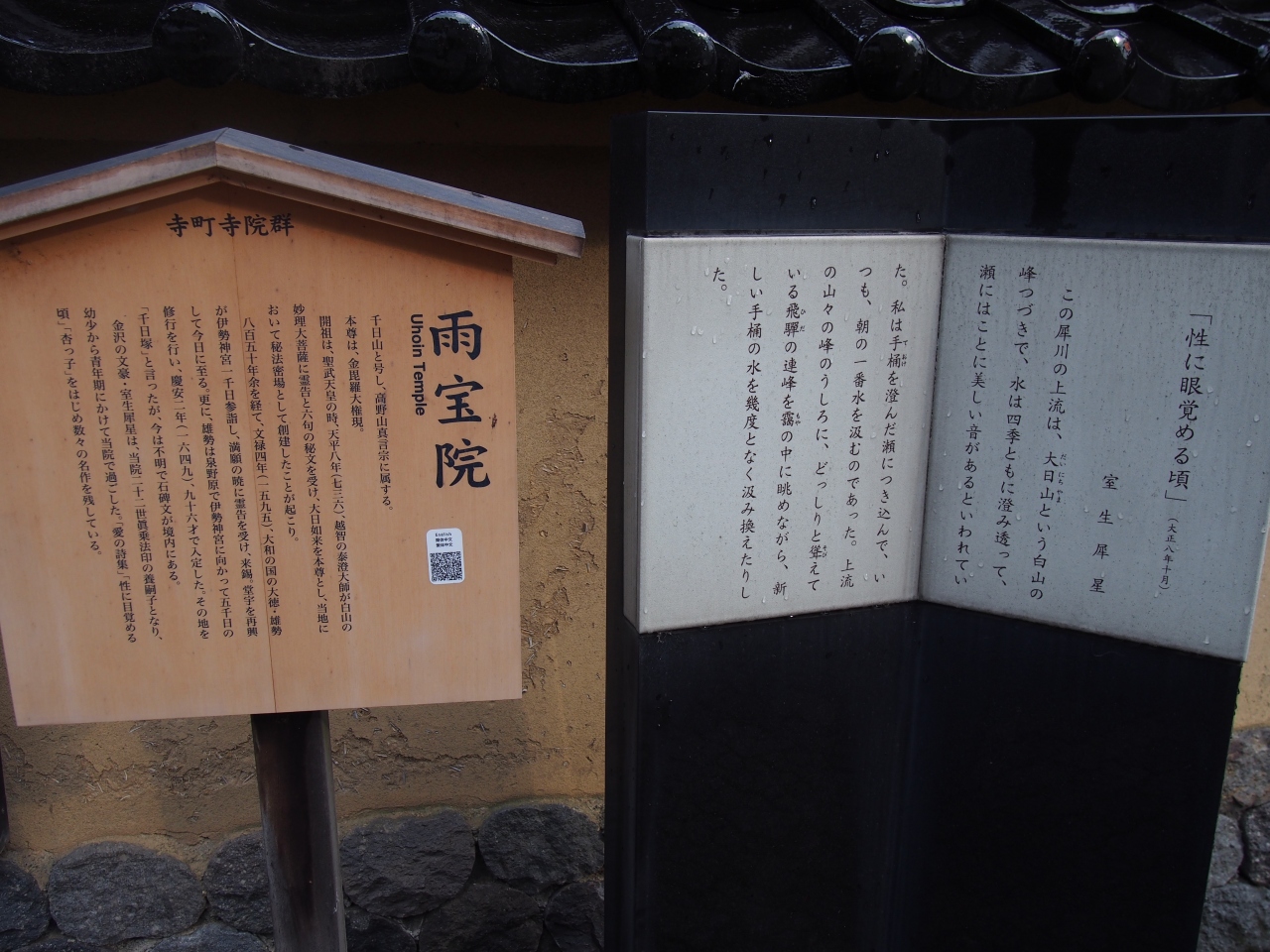香林坊から犀川を越えて犀川大橋を渡ると寺町群と呼ばれる加賀藩が造った寺町があります。そのなかで犀川大橋のたもとにあるのが雨宝院です。雨宝院は室生犀星が幼少期から青年期まで過ごした場所で、犀星の「杏っ子」、「性に目覚めるころ」、「愛の詩集」などの作品に影響を与えたのがわかるような気がします。