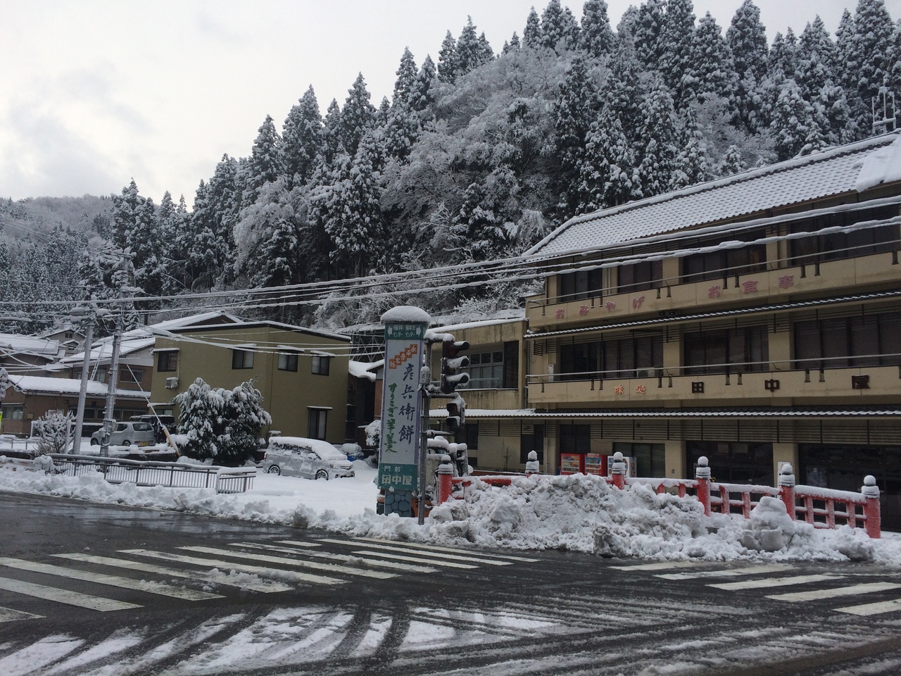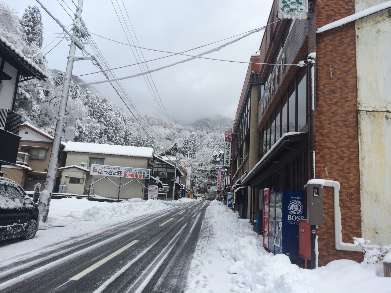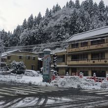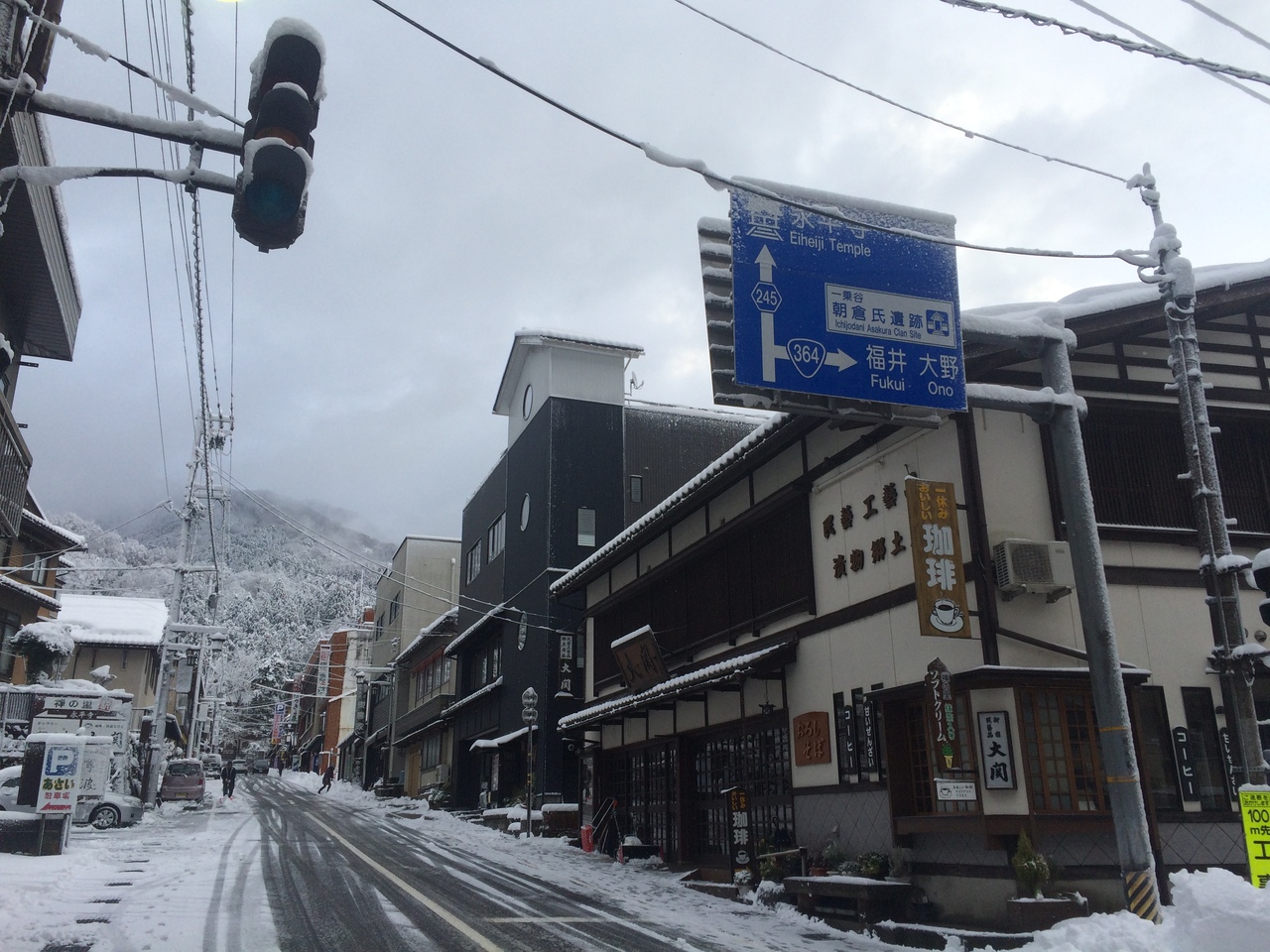 100メートルぐらいの坂道に土産屋、食事処等が並んでいて郵便局もありました。土産購入・食事したら駐車場無料と掲げている店が多いです。朝7時頃通ったら雪かきや除雪をしている店が多かったですが永平寺参拝後、10時前に再び通ると雪かきが終わり営業開始した店が多かったです。