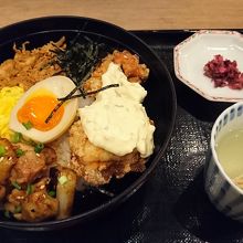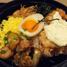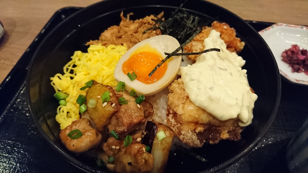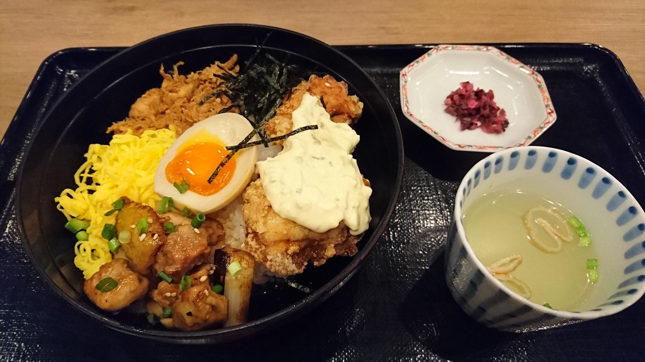 唐揚げ、焼鳥、そぼろ、たまご等鶏づくしの丼でいろんな味をちょっとずつ味わえて美味しく食べられました。