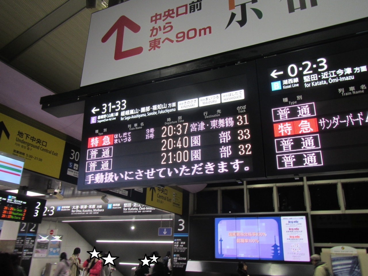 ただ、特急まいづるは、途中の綾部駅で切り離され、舞鶴方面へと向かうため、途中でまいづるとの車両間の行き来ができなくなるとの案内がありました。