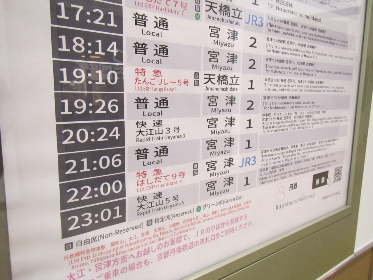 京都駅から福知山駅を経て、天橋立方面へ行く特急ですが、今回は特急まいづるを併結する、シックな「丹後の海」バージョンの新KTR8000系に乗車しました。