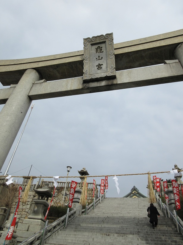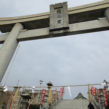 下関の唐戸地区にある神社で、859年に創建された八幡宮です。唐戸市場から道路を渡った一段高いところにたっており、砲台跡や世界一大きいと言われるフグの像などが見所です。石段を息を切らせながら登ると、海峡の眺望を楽しむことができました。