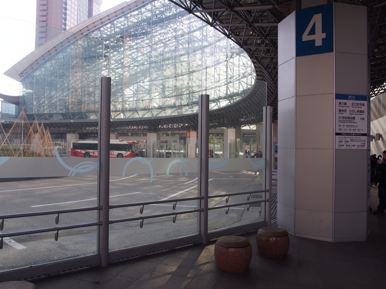 金沢駅の東口を出てすぐ左側にバスターミナルはあります。バス停は1番から6番まであります。路線バス、周遊バス、兼六園シャトルなどもここから出発です。また6番から富山、高山、名古屋などの高速バス停となっています。バスターミナルはコンパクトでわかりやすいのですが、ただ周遊バスや兼六園シャトルには20名を超える列ができていました。バス待ちしているときに金沢も人口からすると地下鉄が必要かもと考えていました。
