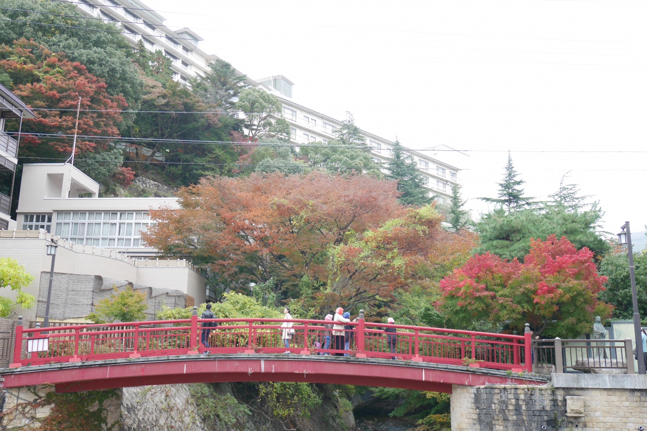 三ノ宮からバスで有馬温泉に向かって到着したバス停からよく見える赤い橋です。