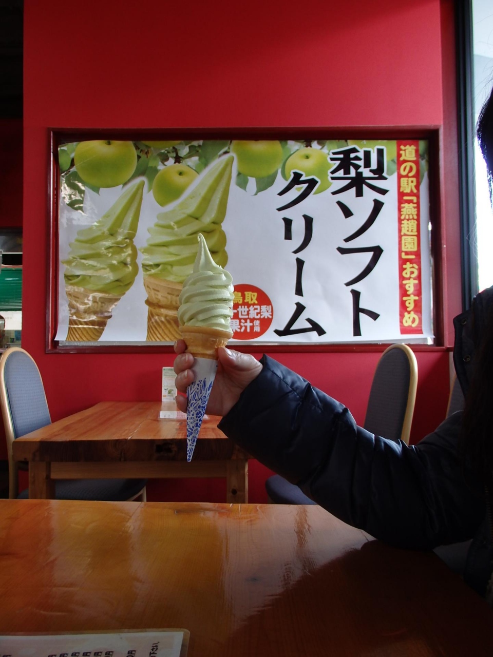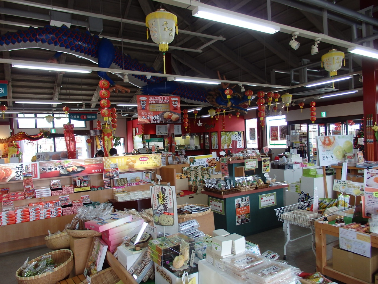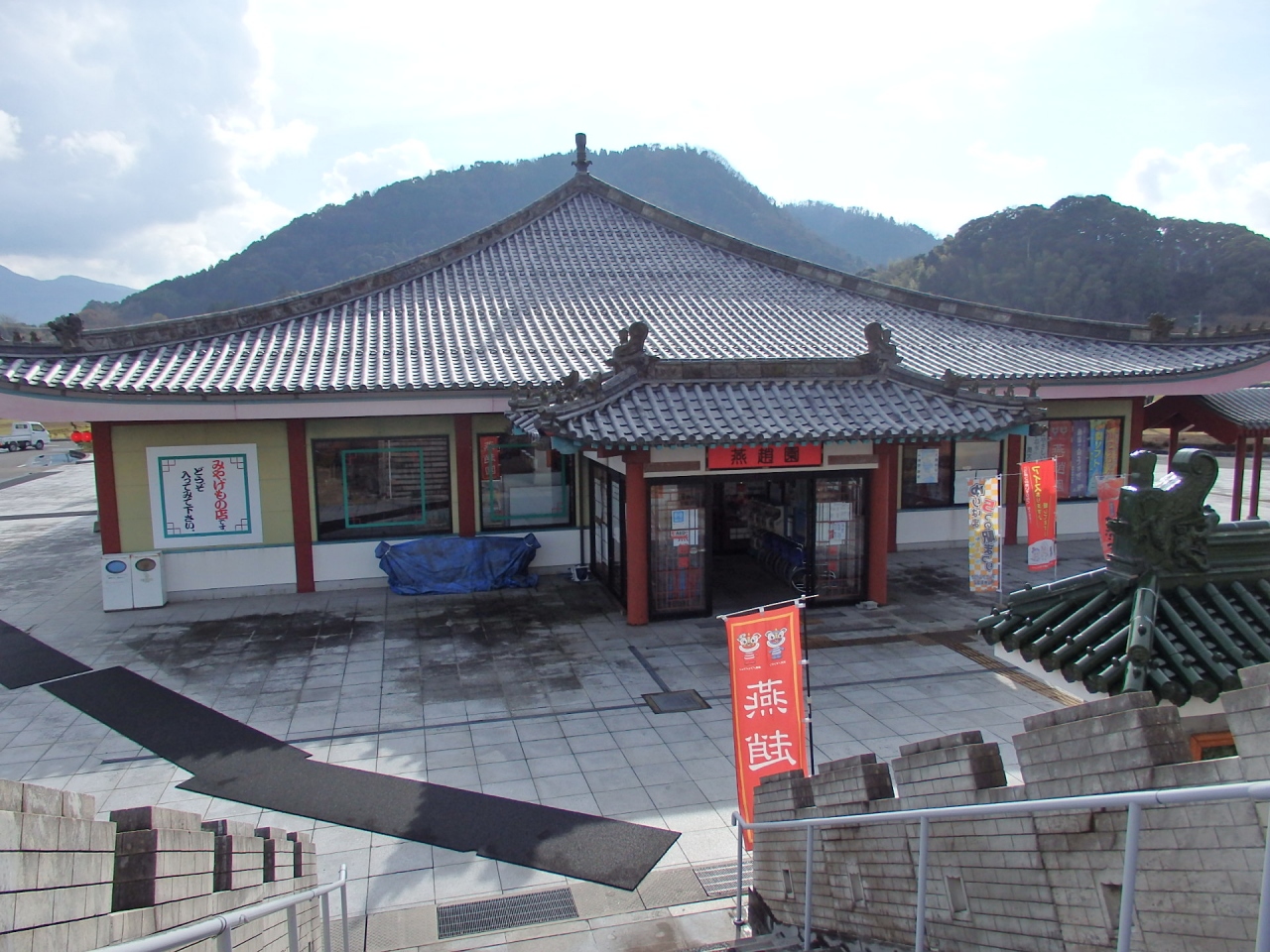 自家用車で中国庭園の燕趙園の駐車場だと思い、入りました。庭園とは、中国風の壮大な架け橋(歩道橋?)でつながっており、そちらを観光してから、道の駅で小休憩をとりました。他の道の駅と同様に鳥取の名産物のお土産が売ってあったのですが、中国風の建物になっていて庭園と一体感を感じました。梨のソフトクリームが珍しかったので食べました。