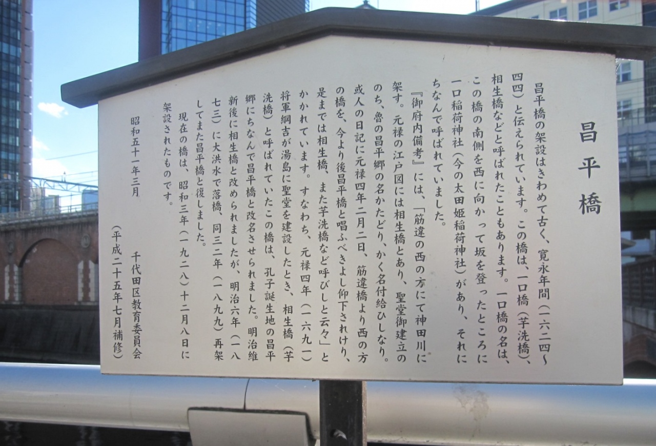 この橋は、1691年(元禄4年)に徳川綱吉が孔子廟である湯島聖堂を建設した際、孔子生誕地である魯国の昌平郷にちなんで、「昌平橋」と命名されましたが、それ以前は「一口橋(芋洗橋)、相生橋などと呼ばれていました。