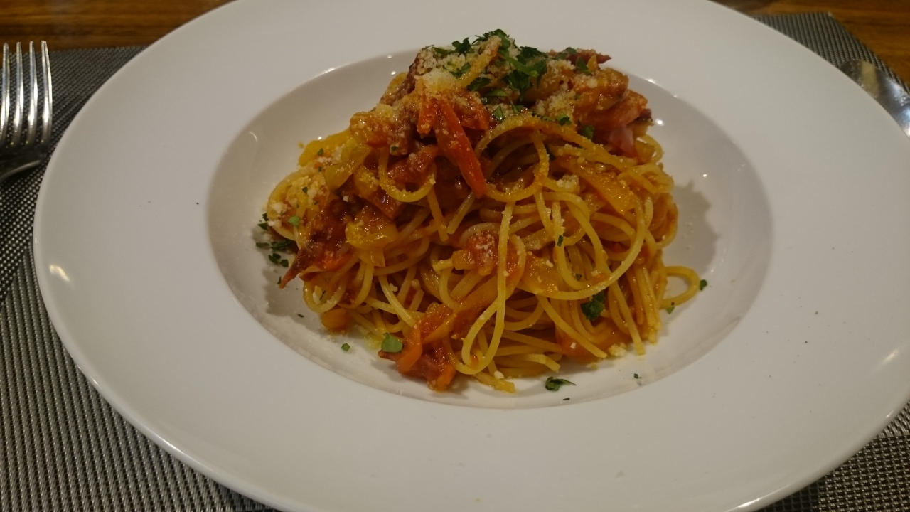 パスタはちょっと辛めのトマトソースのパスタを頼みました。