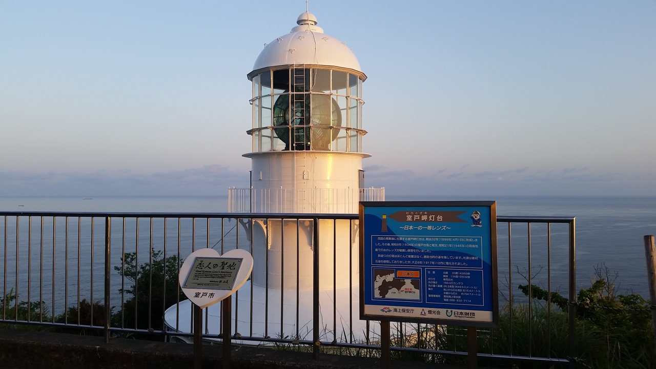 室戸岬から車で坂を上っていき、途中で車を止めて歩きます。意外と距離があります。灯台の横には、恋人の聖地と書かれていて、ここにカップルで訪れると、結ばれるようなことが書かれていました。夕日を見るには格好の場所ですが、夕日は灯台の反対側です。朝日がいいのかな?遅すぎてくると灯台の光がついてまぶしいかも・・・