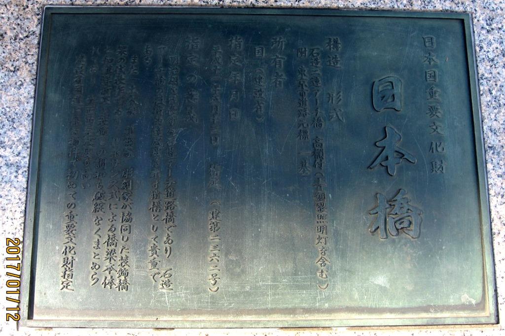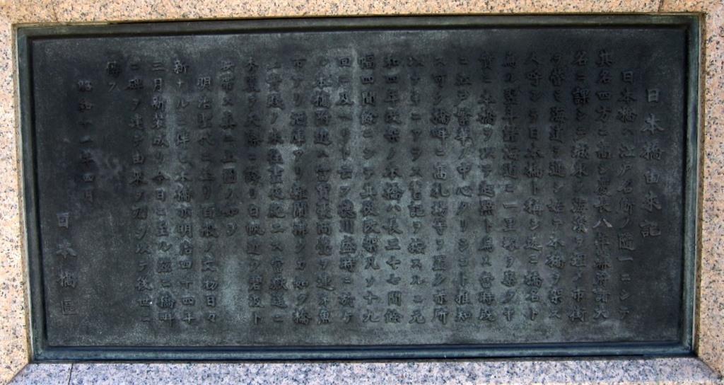 日本橋由来記の碑は、日本橋のたもとの高札広場にあります。高札を模した碑に、銅板の「日本橋由来記」と「日本橋の風景画」が埋め込まれていますが、少々読みにくいです。
