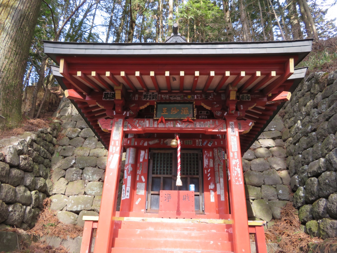 日光街道(国道119号線)沿い、丁度神橋の前、太郎杉隣の日光山内にあります、小さな神社で蛇王権現堂ともいわれています、深沙大王は毘沙門天の化身であり、その昔、仏教経典を求めてインドに向かう幻奬三蔵を危機から救ったと言われてる、縁結び、商売繁盛の信仰があるようです、私が行った時に地元人がお参りと掃除に来ていました。