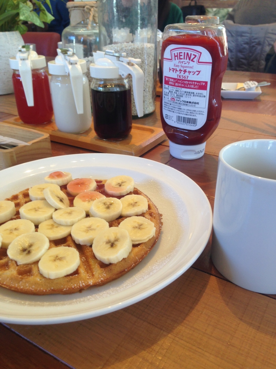 本当はホイップクリームがモリモリのパンケーキも食べてみたかったのですが、とても食べきれそうにないので、クリーム無しのバナナのワッフルとコーヒーにしました。グァバ、ココナッツ、メープルと3種類のシロップがあり、どれも美味しかったです。