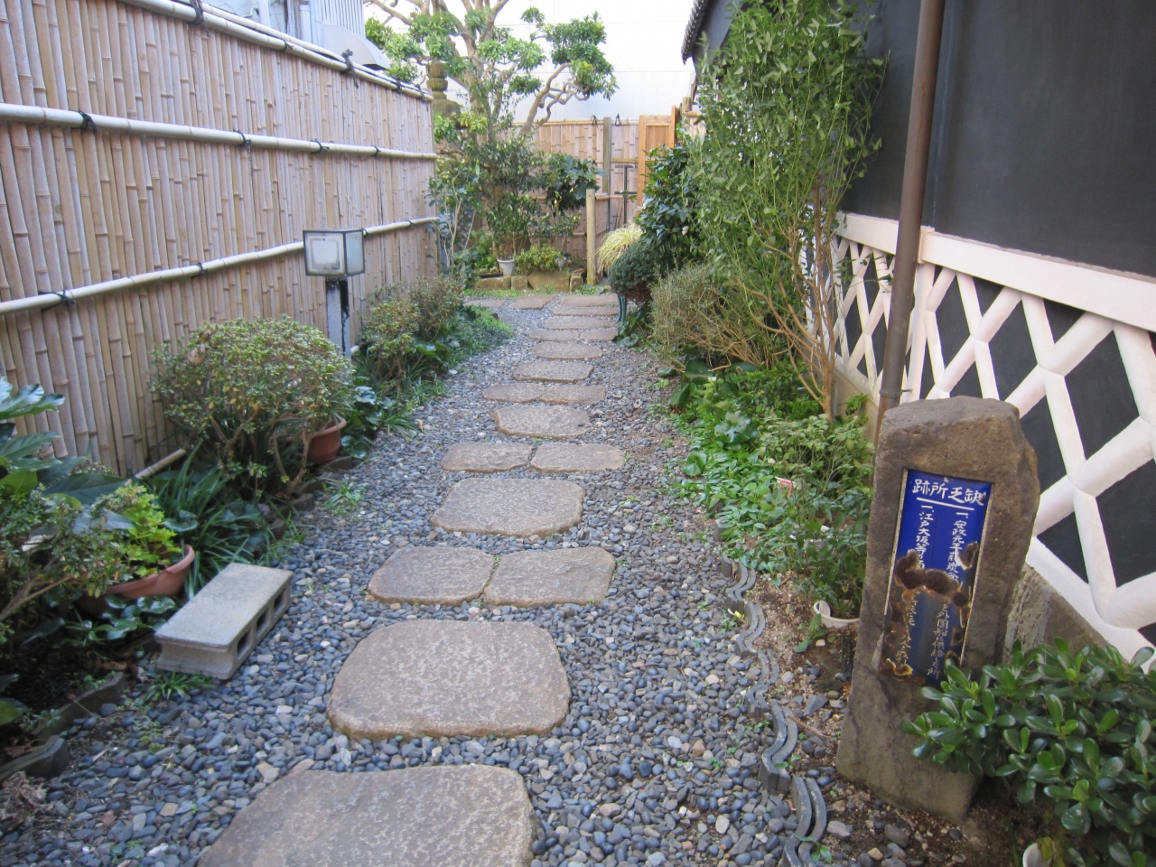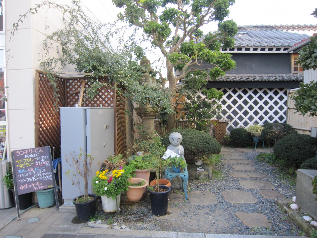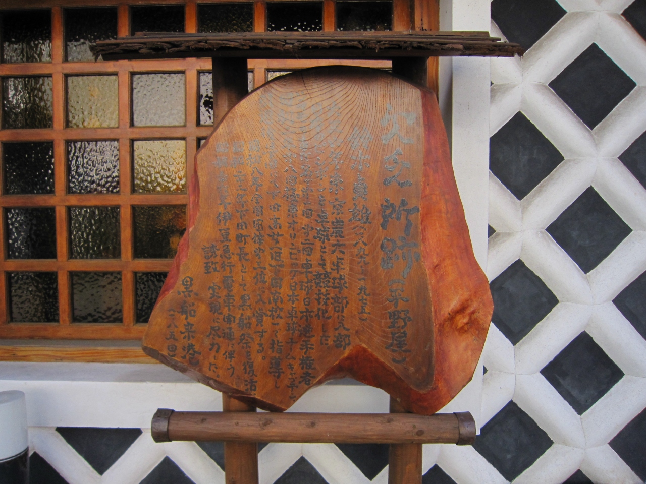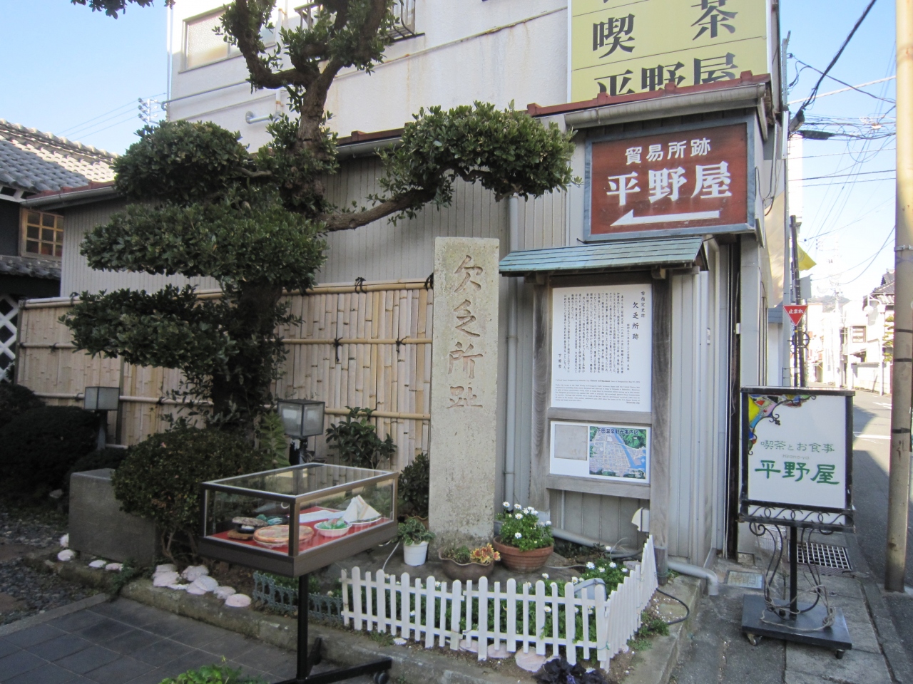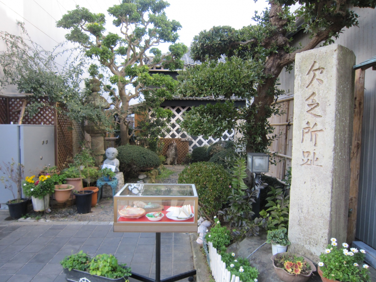 下田八幡神社、文化会館の先で二つ目の交差点左折です。左に曲がり大横町通り50m位先交差点手前右側です。なまこ壁の家です。喫茶と食事「平野屋」で、木製の輪切りの表示板に欠之所跡と記載し掲げており、その横が建物食事処への入口となっています。表示板には欠之所跡とはあまり関係ないような個人の経歴、卓球の競技化、下田町長時代の実績、伊豆急行開通に尽力等と記載していました。そして敷地内細道を行くと別の通りからの敷地への入口がありました。交差点を右折した先にある敷地入口です。そこには石碑と説明板がありました。食事をする予定がなく建物の中には入りませんでしたが、敷地の両入口には食事のメニューがありました。なお、欠之所とは分かり易く言えば貿易した所なのでしょう。下田開港で色々と関連する所、仕事場が出来たのですね。