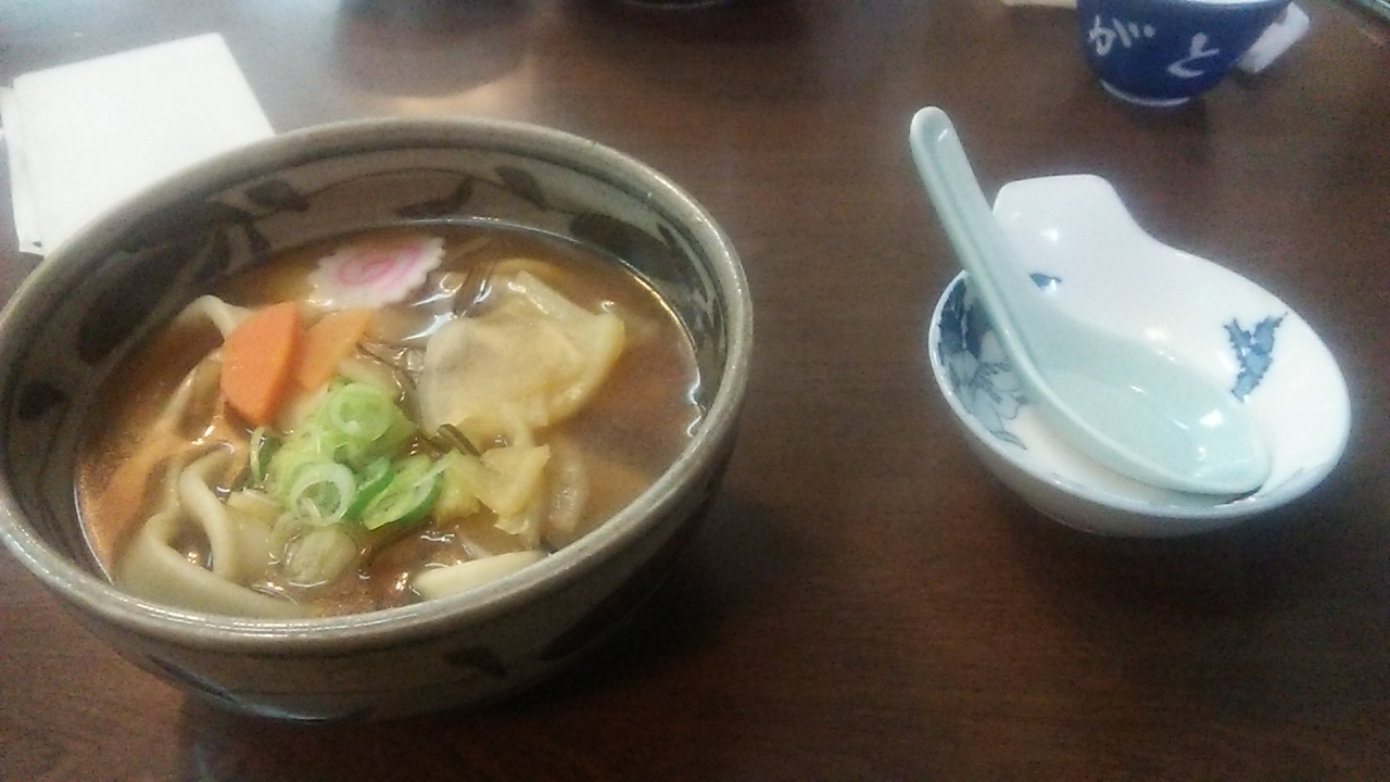 秩父鉄道長瀞駅近くの食堂。店内は昭和の観光地の食堂という雰囲気で、テーブル席と小上がりがあって、ほどほど広い。長瀞名物「おっきりこみうどん」を食べたが、あまめの汁に多くの野菜の具、幅広のもちっとした麺がマッチしておいしい。