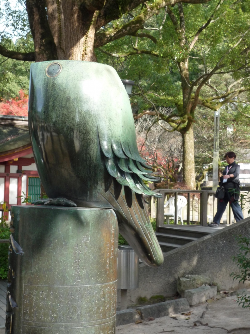 この銅製の鷽像は嘉永5年(1852年)に近くにある麒麟像とともに奉納されました。