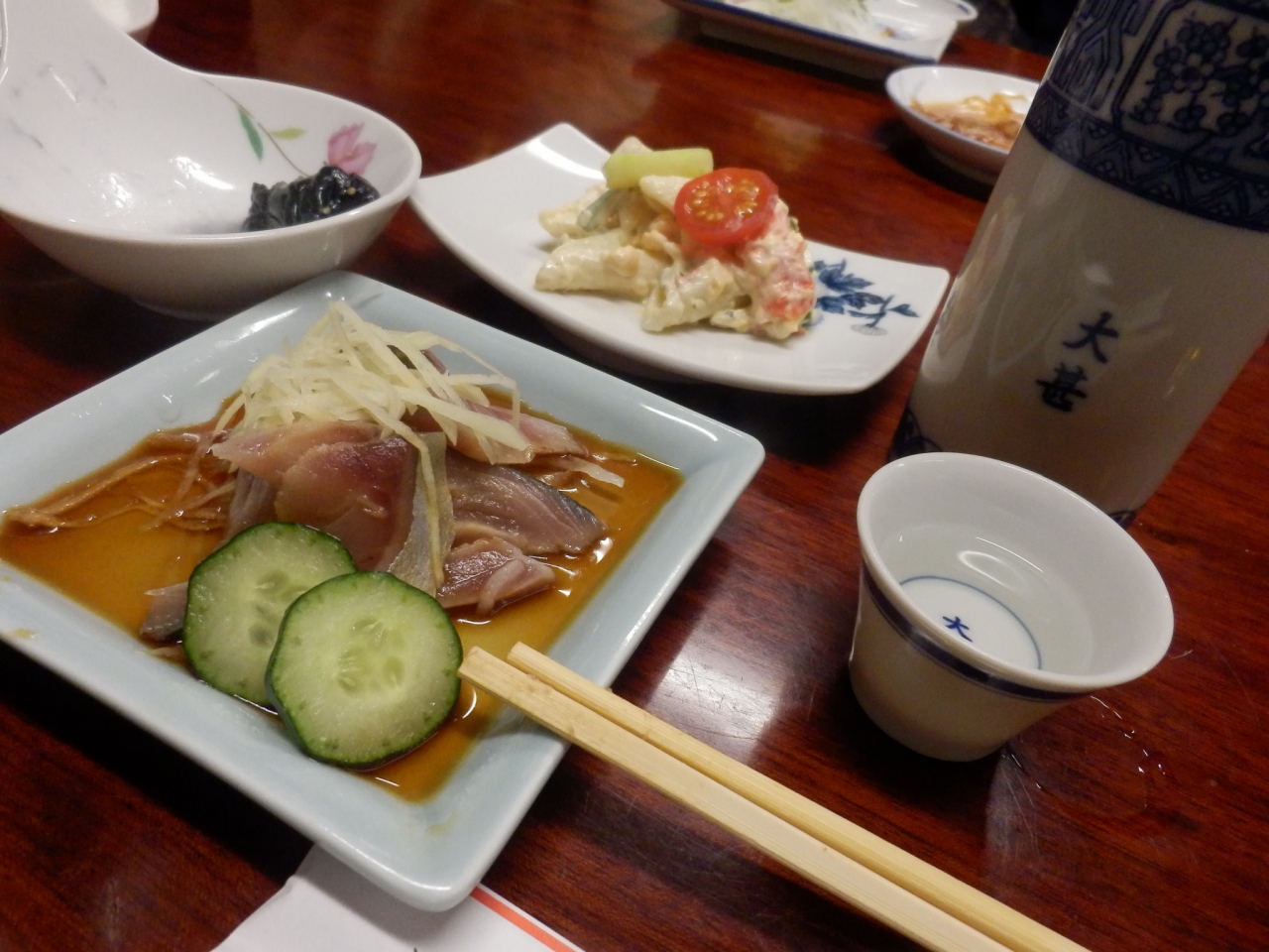 おつまみはとにかく種類が豊富で、一人用の小皿に野菜や魚料理が盛られてました。価格の詳細は不明ですが、おそらく一皿100~300円ほどだと思います。ショーケースに置かれたお刺身は少し高めで、生の魚を指差して調理法を指定して料理してもらうことも可能なようです。