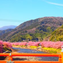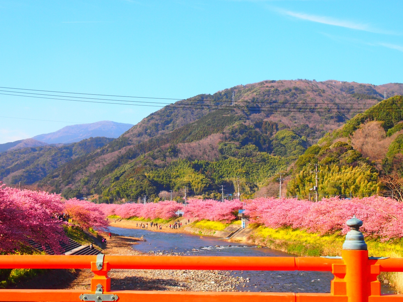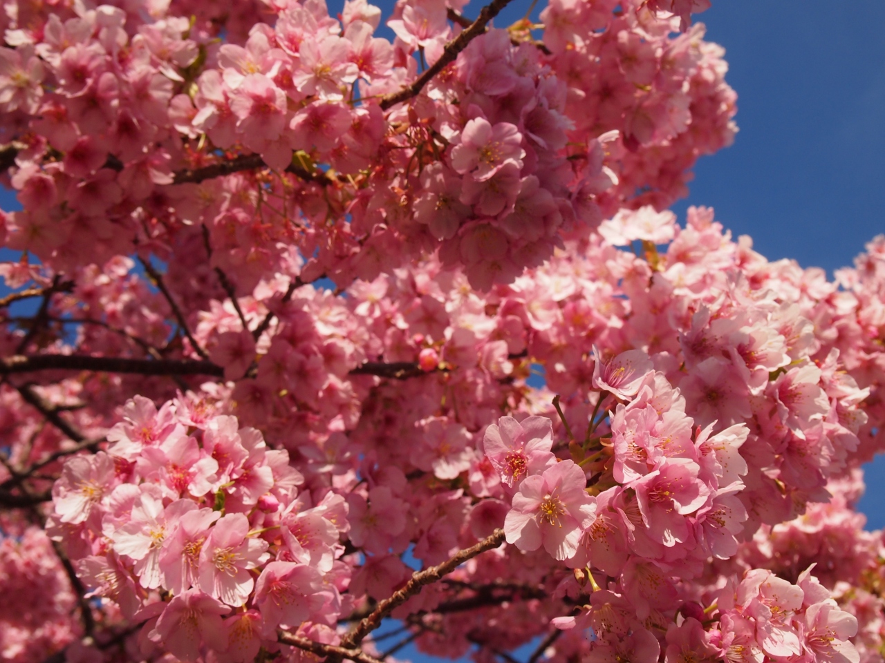 河津駅周辺で楽しめる桜です。 2月中旬くらいが見頃なので、ソメイヨシノなどとは咲く時期が違い、桜の花自体もピンクが濃くて写真映えする花ですね。