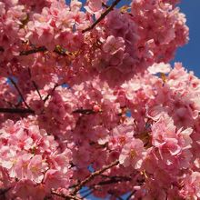 2月が見頃の、濃いピンクの桜。 満開の時期は平日も激混み!
