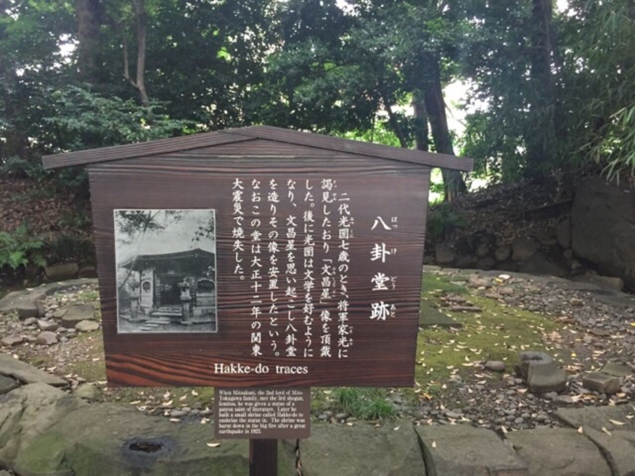 二代水戸光圀が七歳のときに将軍家光に謁見したおり、文昌星像を頂戴したが、後に光圀は文学を好むように、文昌星を思い起こし八卦堂を造りその像を安置した建物です。