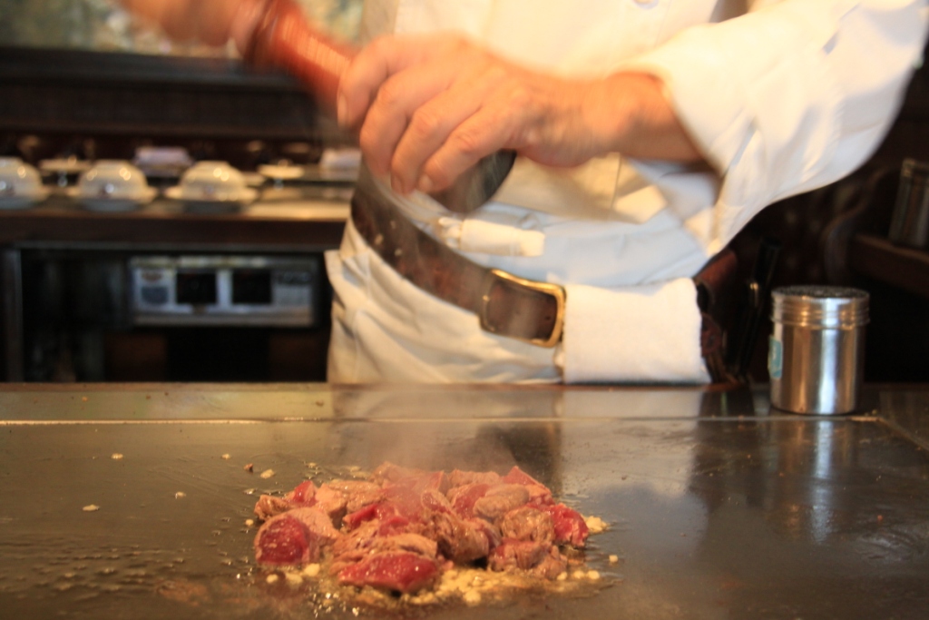 鉄板焼きで供されるものは、肉(ステーキ)だけではなく、パン(ガーリックトースト)、付け合わせ(野菜・ゴーヤチャンプルーなど)。また、料理をしながら調味料のミルなどでジャグリングなど、とってもノリがよく楽しい食事です。