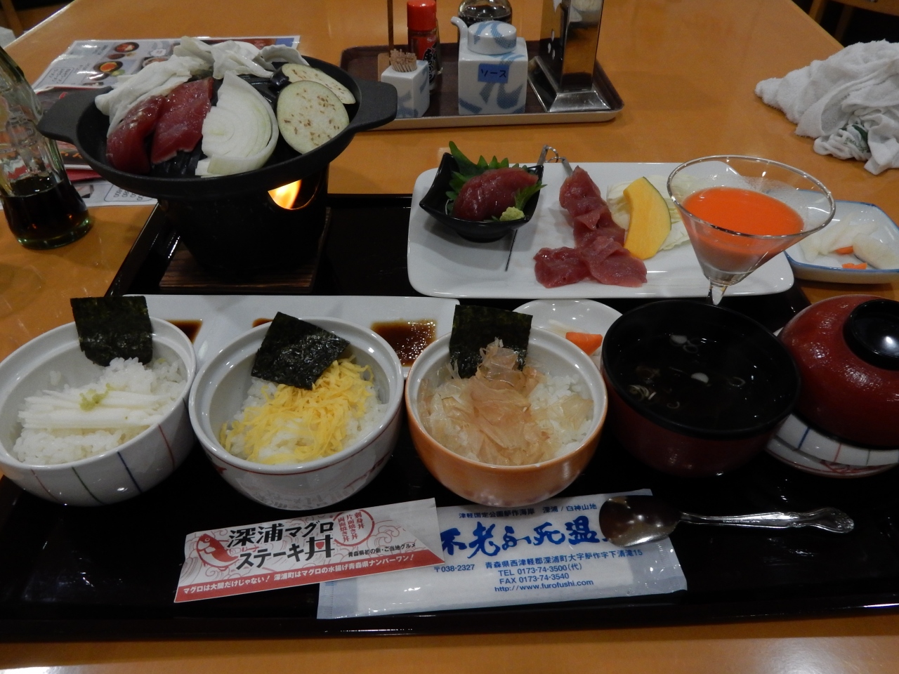 近くの深浦港で獲れたマグロをお刺身のほか、片面焼き、両面焼きで焼いて(固形コンロの鉄板が出てきます)、焼いた野菜と一緒にご飯に乗せて食べます。