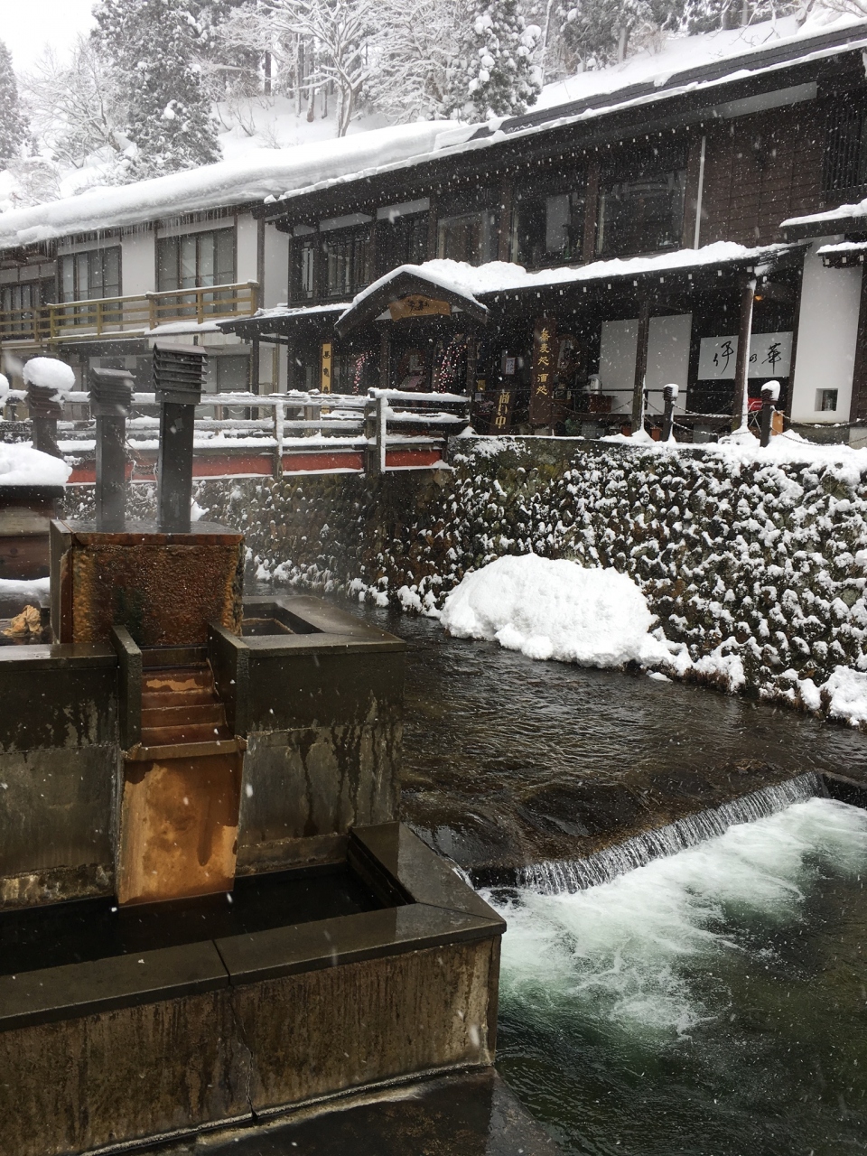 フォトジェニックな銀山温泉の町並みをバックに記念撮影するにも良い場所です。