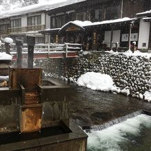 銀山温泉の中心部には、無料で足湯が出来る和楽足湯があります。