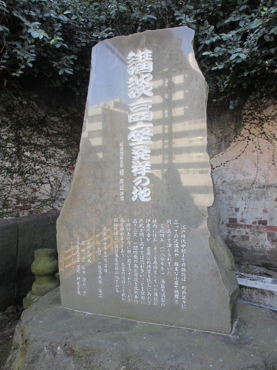 湯島天満宮の天神石坂(男坂)を上がった先の左側にあります。江戸時代中頃まで講談は辻で行われていました。境内で徳川家康の偉業を語る時に高座から講談したことから発祥の地となりました。2005年の除幕式には人間国宝の講談師や区長などが列席し盛大に式典を行ったようです。そのような碑をじっくり見たかったのですが、梅まつりに訪れたので屋台が並び、碑が隠れていました。他の碑も屋台の後ろに隠れていました。次回静かな時にじっくり見たいと思います。湯島天満宮境内には碑が幾つかあるので探しながら由来を見るのも面白いです。