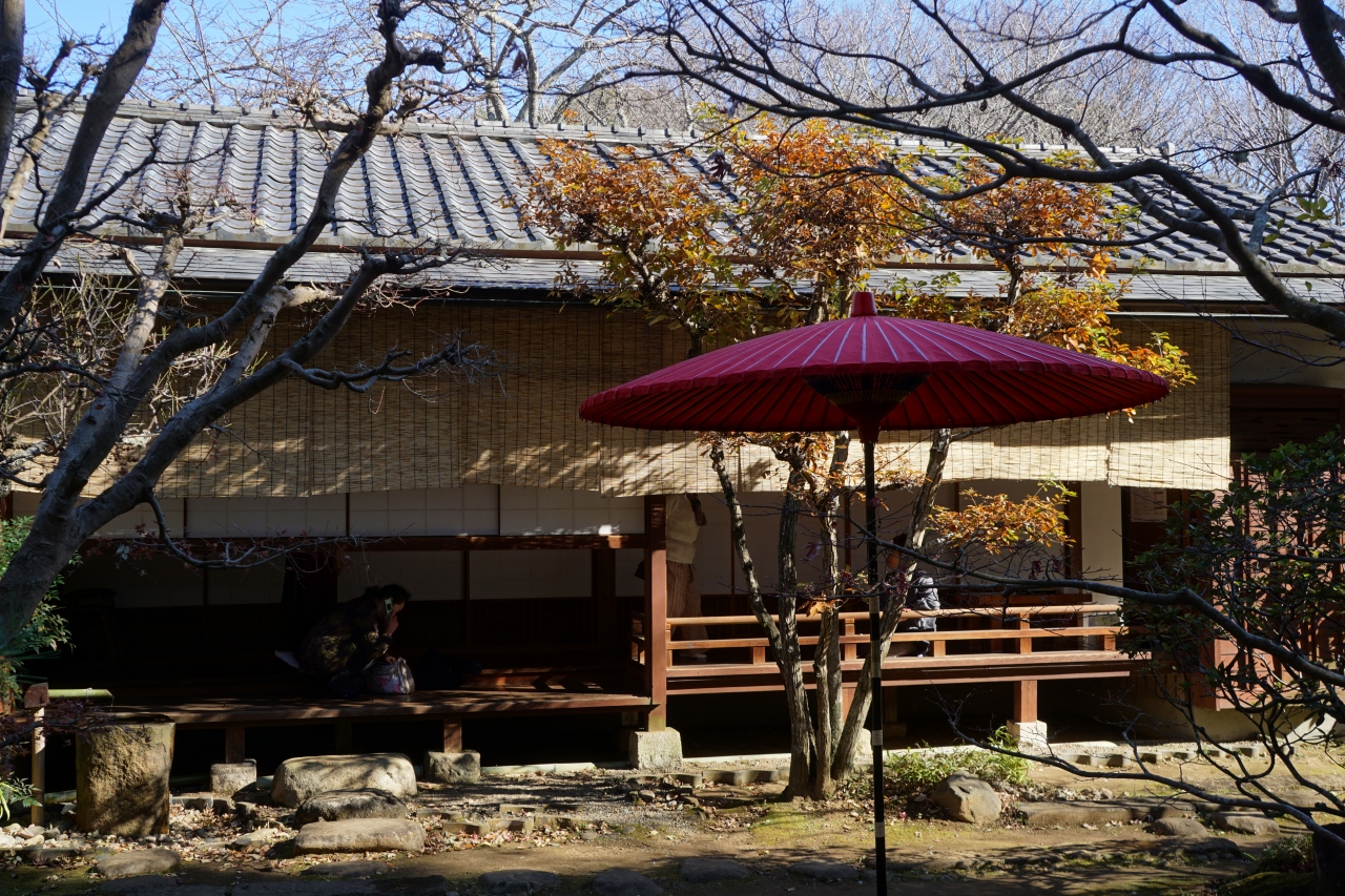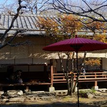 茶室なので、建物は自然に溶け込んで目立たないのですが、この茶室は大徳寺の塔頭、孤蓬庵の忘筌を模したものだとか。東京の乃木神社から移築されました。この日も茶席が開かれていて、縁に座っている人影がポツポツ見えました。
