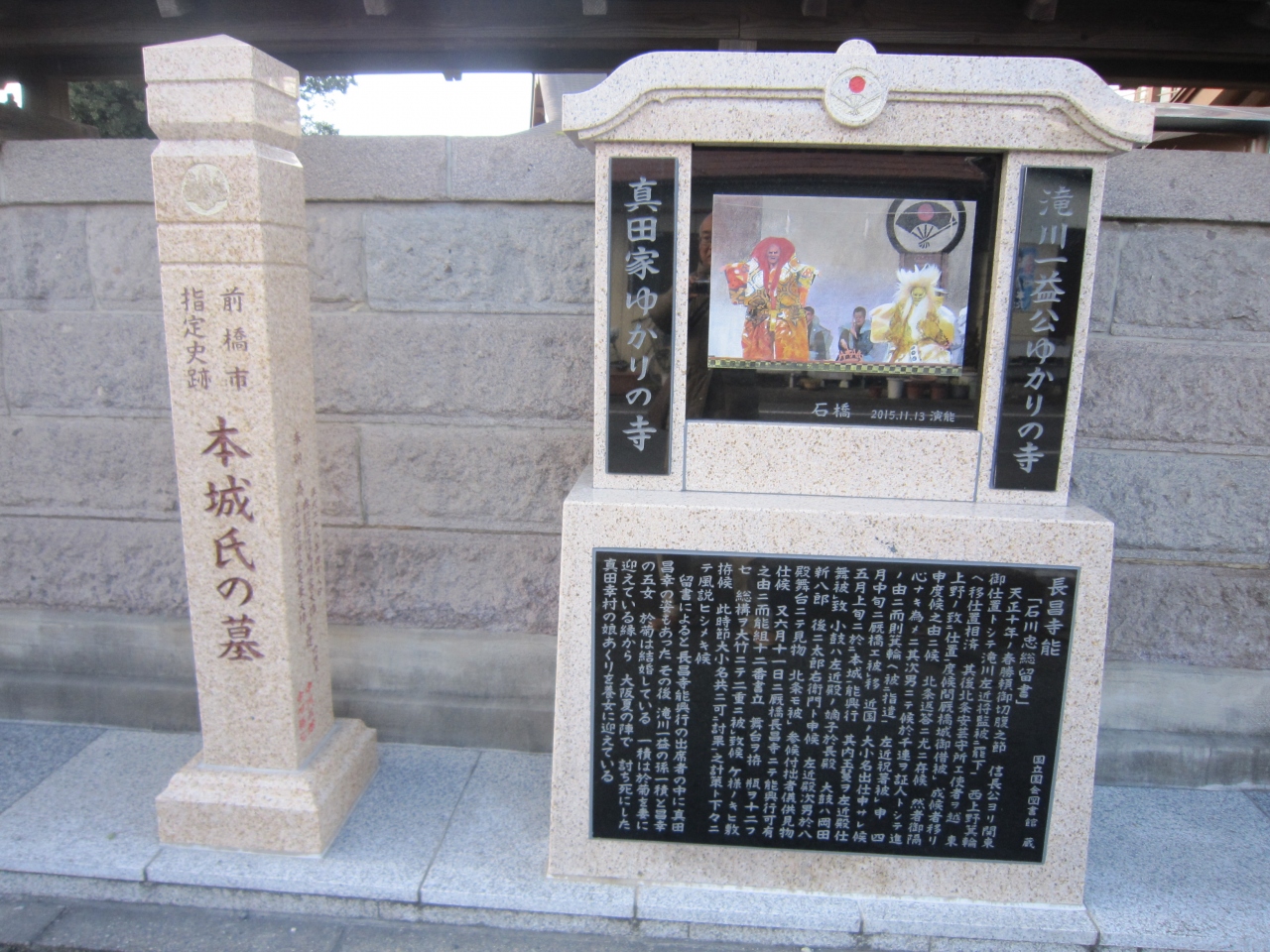 前橋駅から左方向に1.2Km位、徒歩20分位、県庁からは右方面600m位です。山門と塀、車の出入口があります。山門の横に群馬県能発祥の地の石柱、山門前通路には幸安橋・且て門前を流れていた風呂川の上に架けられた石橋とあり、塀の前には滝川一益公ゆかりの寺、真田家ゆかりの寺と能の留書の石碑、前橋市指定史跡本城氏の墓、お寺の由緒等が建っています。山門を入ると正面に本堂、左にぼけ封じ観世音菩薩、本城氏の墓、右に寺務所がありました。ぼけ封じが効くように観世音菩薩に丁寧にお参りしました。石碑等がなければどのような由緒あるお寺か分かりませんが、石碑等があるおかげでお寺の由緒を知ることができました。綺麗に整備されているお寺でした。