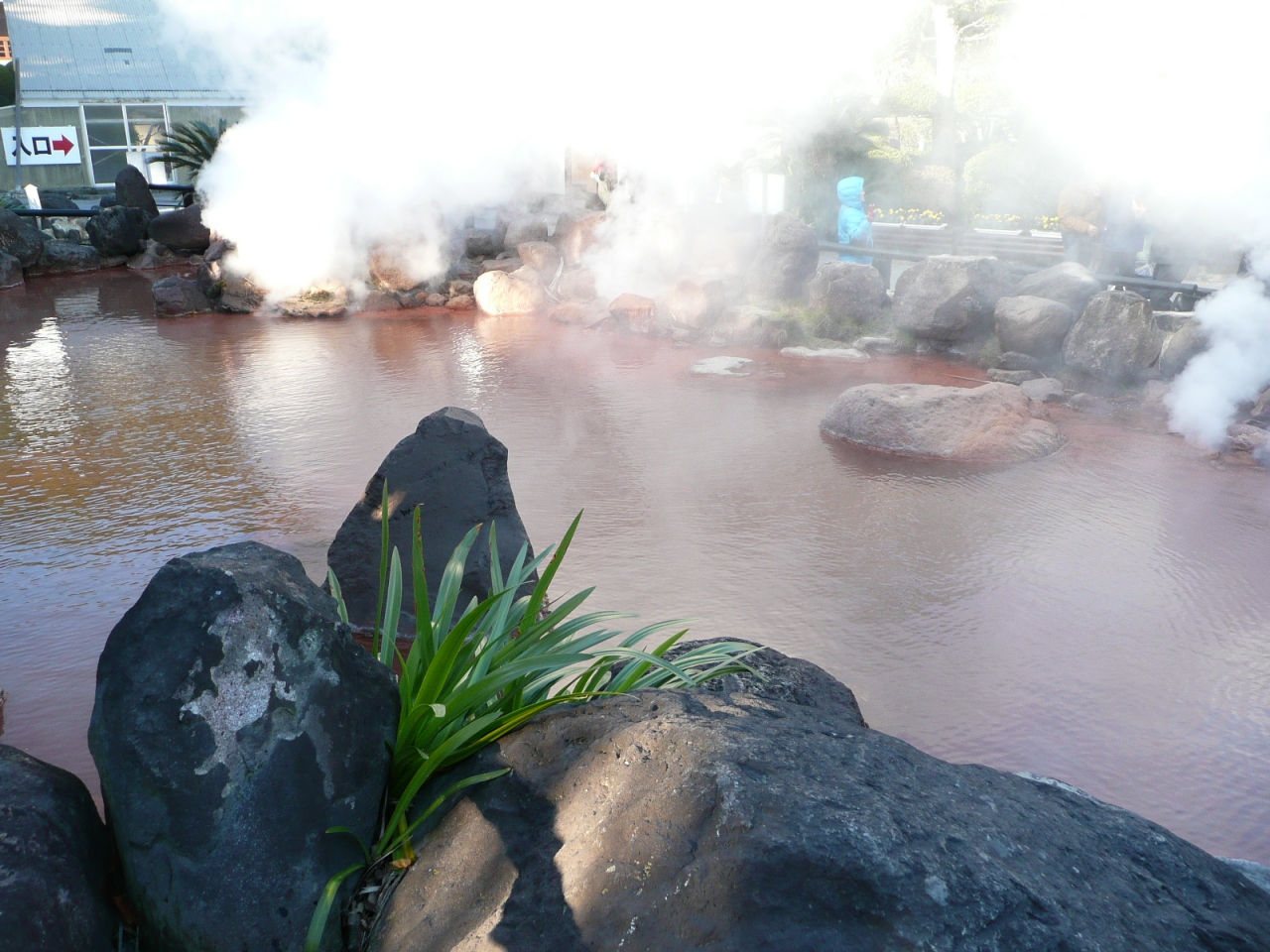 入口から近い位置では、ブルーカラ-の池から湯煙が登っていました。しかし、坂を上って展望台から見ると、赤茶けた色に見えました。見る角度によって、池の色が変わって見えるようです。