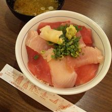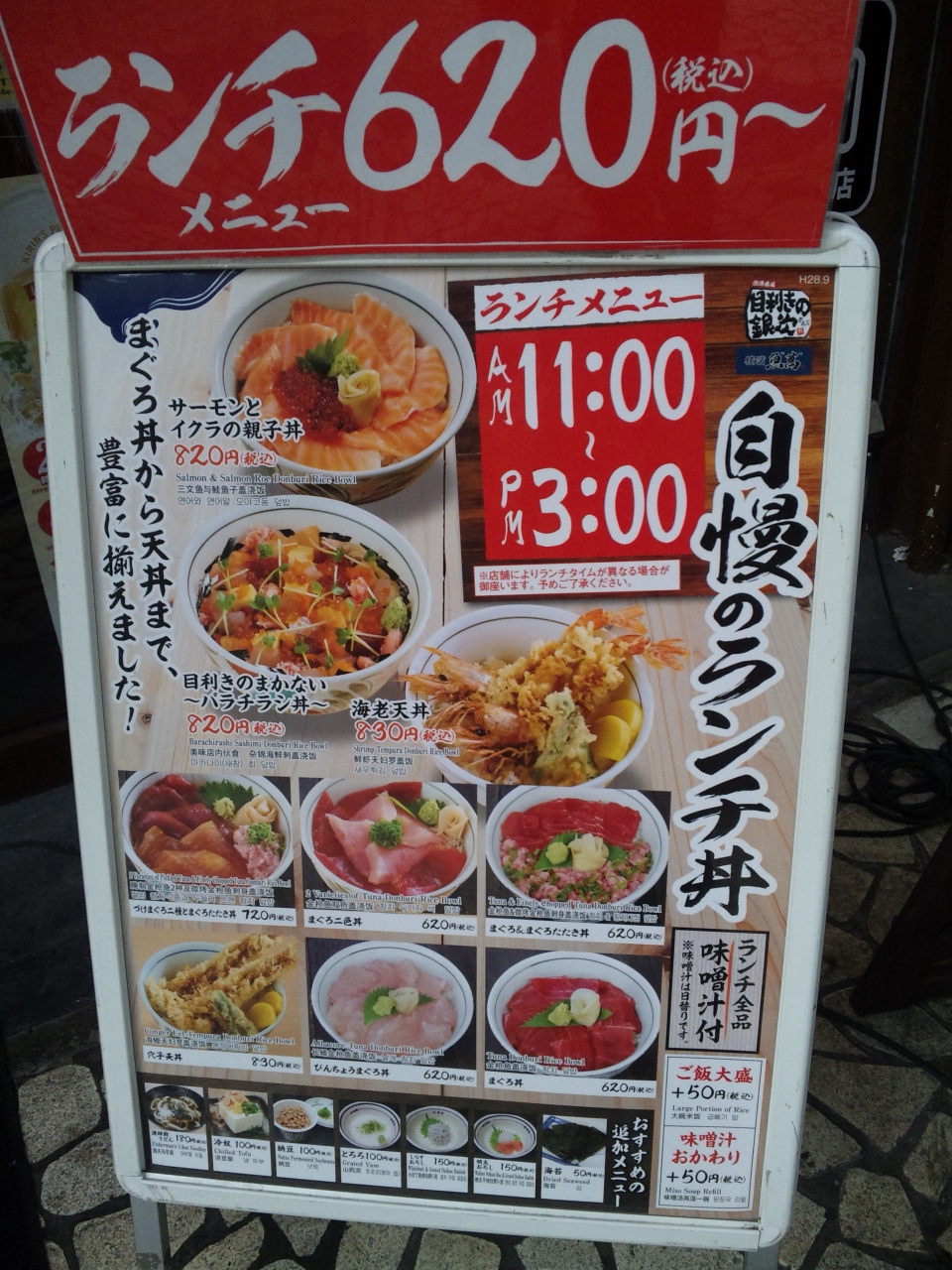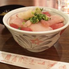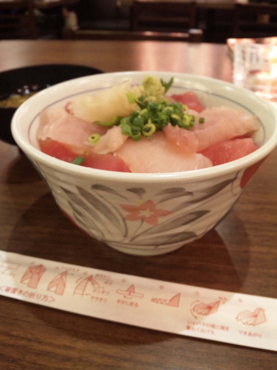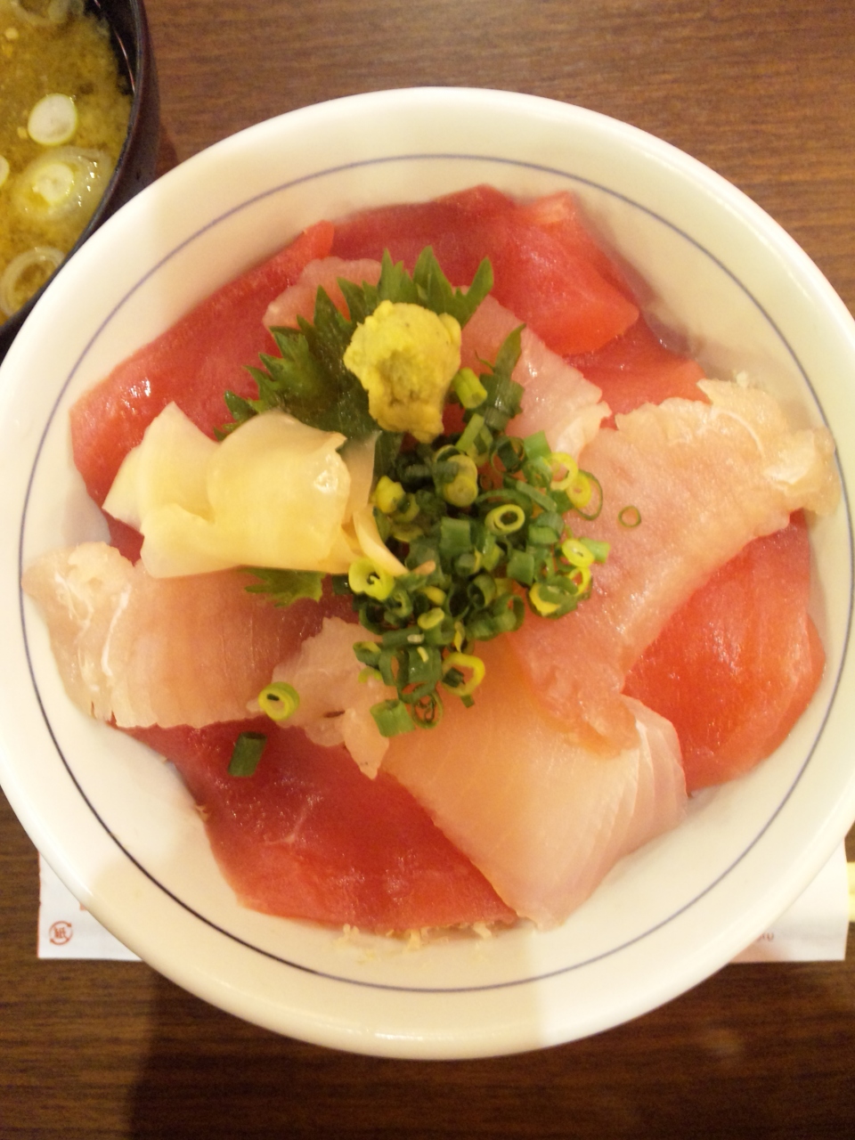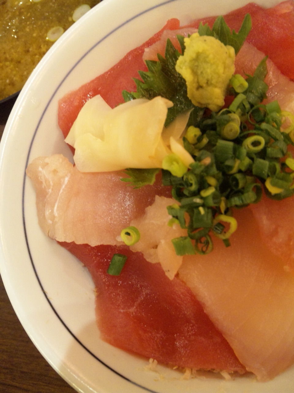 海鮮系居酒屋さんですが、この界隈では朝食・ランチ営業している希少なお店です。ランチは海老/穴子 天丼と、まぐろアレンジ丼が揃ってます。まぐろ二色丼をいただきましたが、丼に赤身/びんちょうがギッシリの好いお品でした。