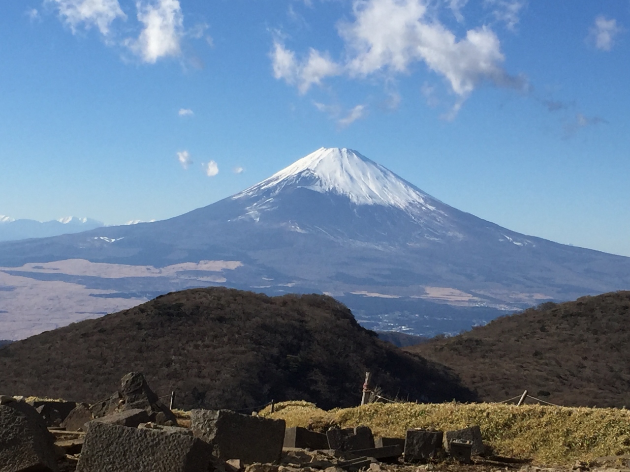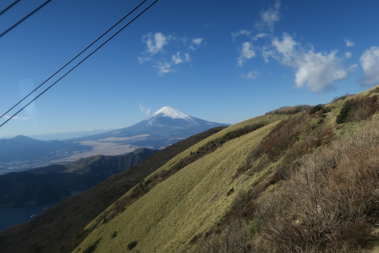 ロープウェイ乗り場に着いた時はあまり人がいなく、季節柄こんなものかと思っていたら乗車時刻近くなってきたら外国人観光客がどやどややってきて、結局満員。幸い進行方向左手側のドアに張り付くように立っていたので富士山が見えました。